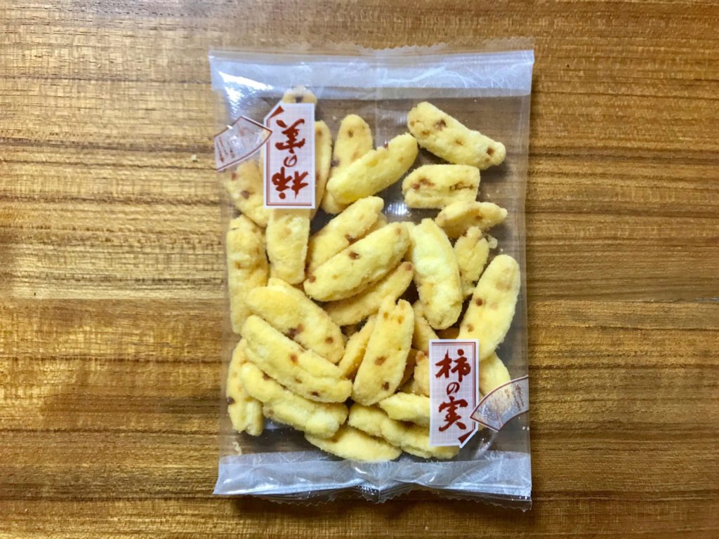 柿の実は昔ながらのピーナッツ揚げで形は大きめの柿の種のようで四角形ではなく外側がカーブになっています。阿部幸製菓でのロングセラー商品ということなので、すでに知っている人もいる商品かもしれませんね。私は今回初めてこの柿の実という商品を知りました。揚げているので柿の種とは違うサクサクッとした口当たりがクセになる米菓ですね。