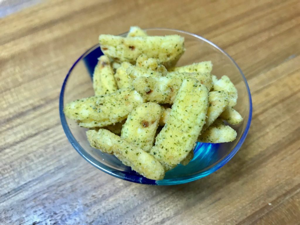 のり塩もお菓子の定番のフレーバーですね。塩にのりがプラスされているので香りがすごく良いですね。一粒一粒に見てわかるようにのりがしっかりとまぶしてあるので、のりの旨味をしっかりと楽しむことができます。一噛み一噛みのりの風味が口の中に広がりクセになる味付けです。一見地味そうですが食べ比べたら一番人気が出そうな味付けだと思いました。
