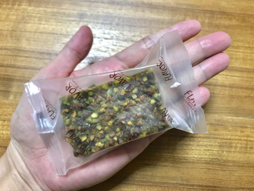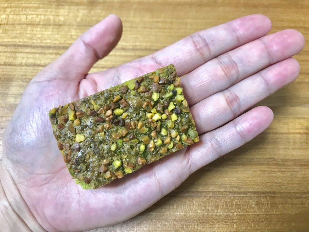 抹茶生地はしっとりしていて甘さがしっかりしていて一つで満足感があります。チョコレートのブラウニーはよくありますが抹茶とピスタチオの組み合わせは初めてだったので新鮮な感じでした。自分用のおやつとしてもお土産としてもオススメできる抹茶ブラウニーです。