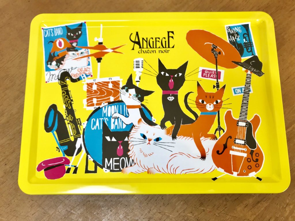 黄色い缶に4匹の猫と楽器のデザインが描かれています。