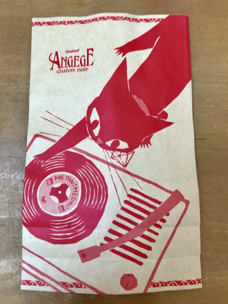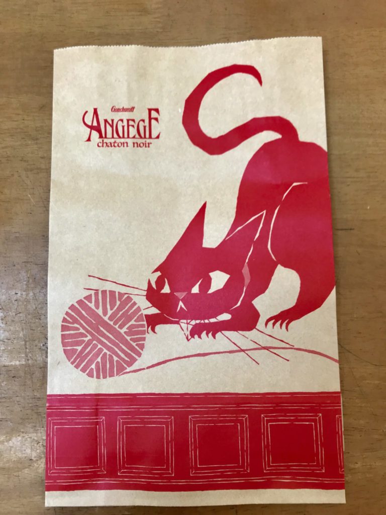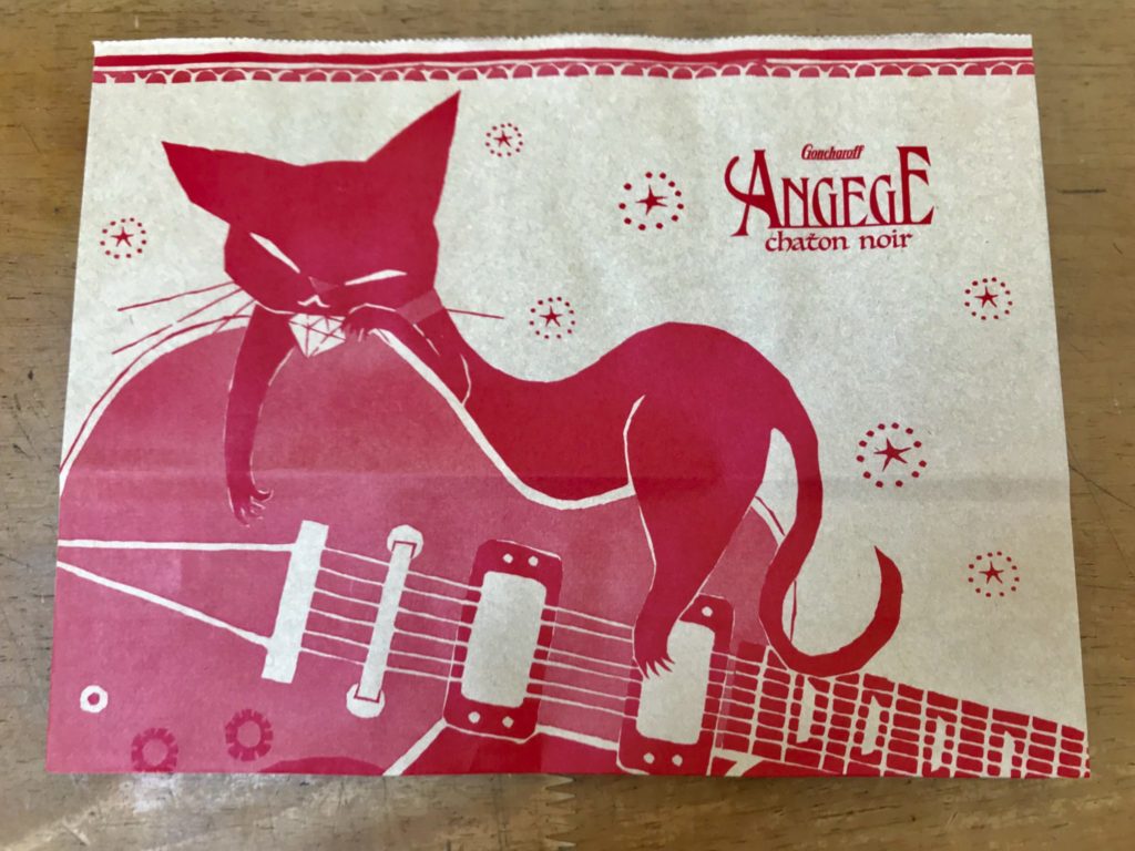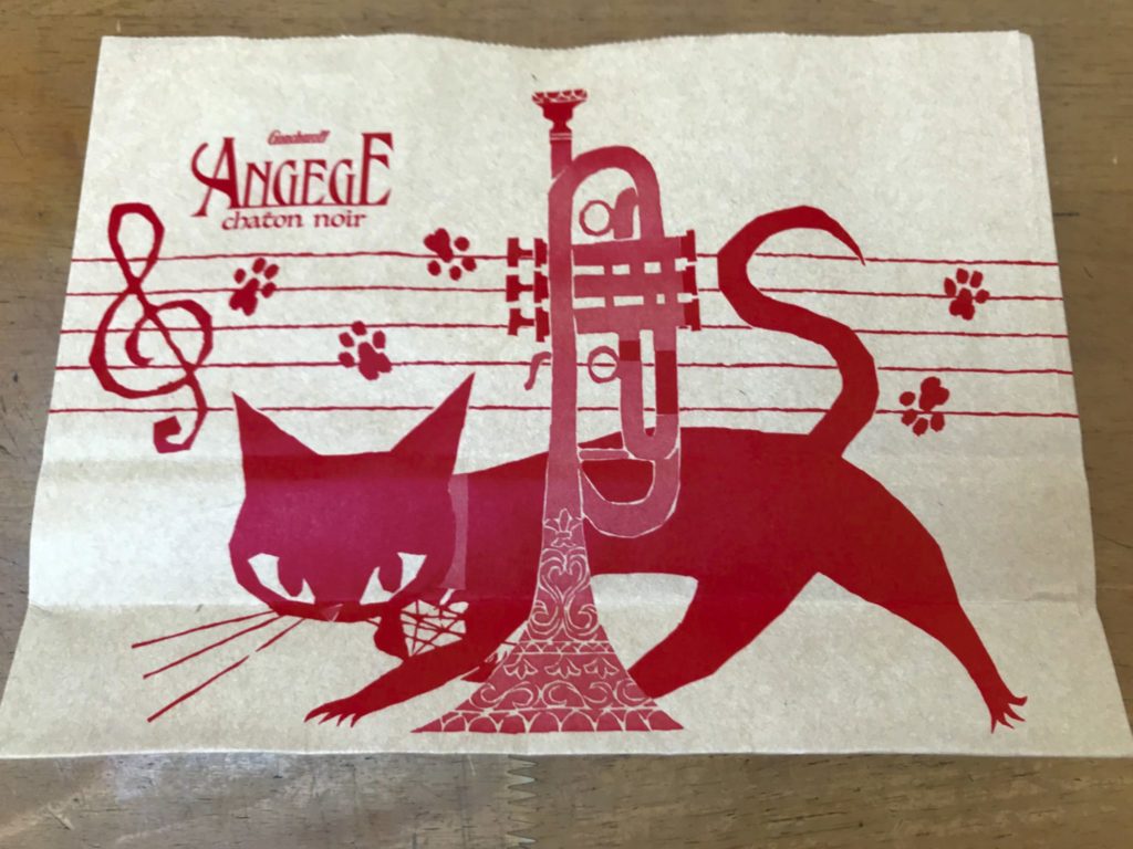 シンプルで紙袋タイプの包装紙で黒猫を赤で表現していて鮮やかかつ