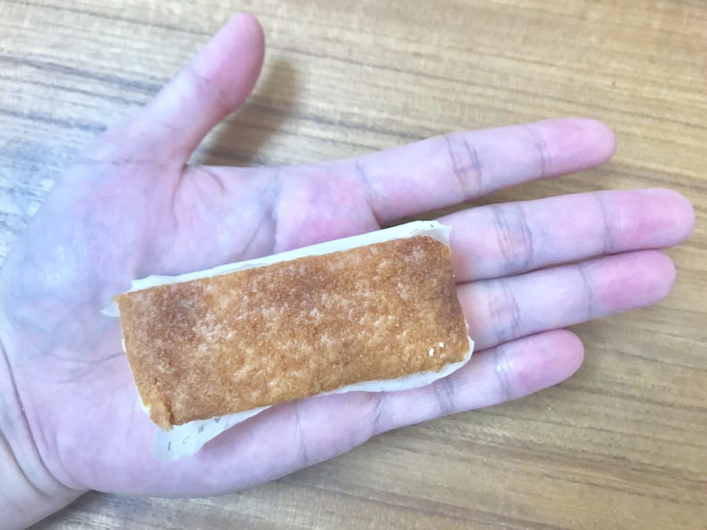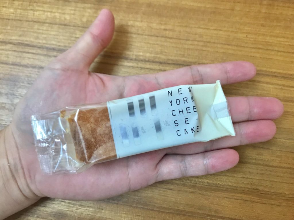 ニューヨークチーズケーキのカロリーは1個105kcal。おにぎりの半分くらいのカロリーなのは嬉しいポイントですね。厚さは約3cm長さは約7.5cmと食べ応えがある大きさです。紙の台紙が付いているので手を汚さず食べれるのでこれからの春の行事お花見やピクニックにもオススメ。