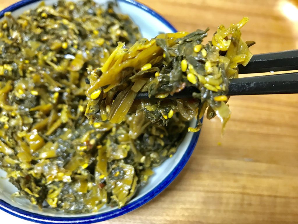 まずはちりめん辛子高菜をそのまま食べてみます。シャキシャキ食感にちりめんの風味が良い感じですが、結構辛さがあります。この辛さはクセになる辛さですが、辛いものが苦手な人は要注意。味付けがしっかりしているので、そのまま食べるにはお酒のアテとしてが良いと思います。後引く辛さがお酒と合うこと間違いなしですね。