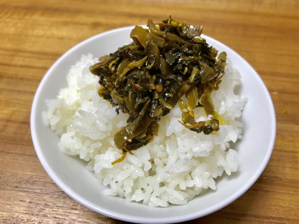 辛さが強めの高菜なのでご飯と混ぜておにぎりにしてみました。ご飯に乗せて食べるよりも辛味がご飯全体に広がりマイルドになりました。高菜本来のシャキシャキ感は失われずにちりめんの魚介の旨味もあって手軽なおにぎりで食べるのもいいですね。職場や学校にこの高菜おにぎりを持っていっておかずや汁物はコンビニで買うのもよいですね。