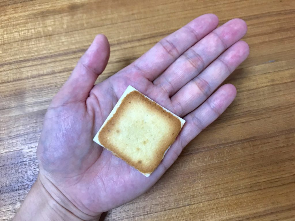 綺麗な焼き色がついたラングドシャにはみ出る大きさのホワイトチョコレート。