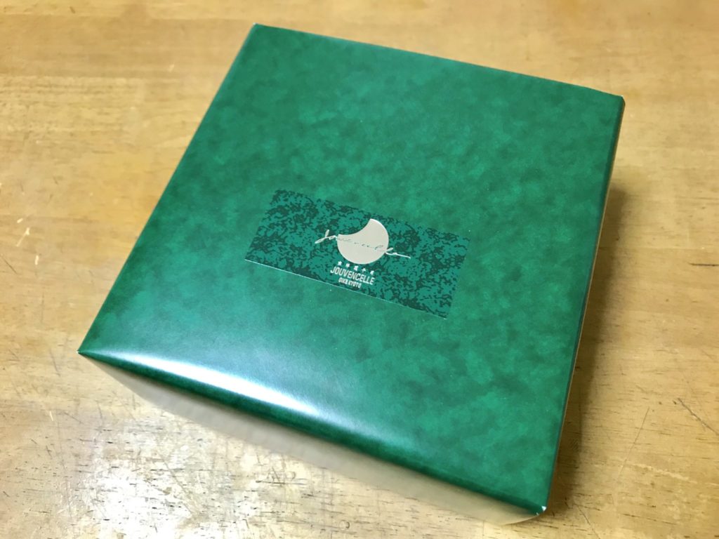 ジュヴァンセルの包装はいつ見ても綺麗なグリーンですね。包装紙を外すと黒い箱に翠一福の文字が書かれた帯が貼ってあります。箱を開けると真空パックになている緑色のクグロフのお目見えです。