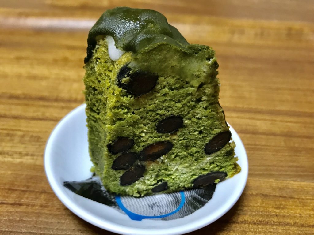 抹茶チョコレートの濃さがわかるくらいの濃い緑をしているのがよくわかります。生地にうっすら見える黒豆もたくさん入っているのがわかります。抹茶生地は綺麗な黄緑で見た目から美味しいというのがひしひしと伝わってきます。