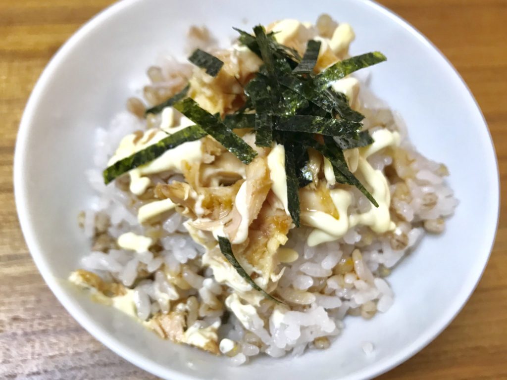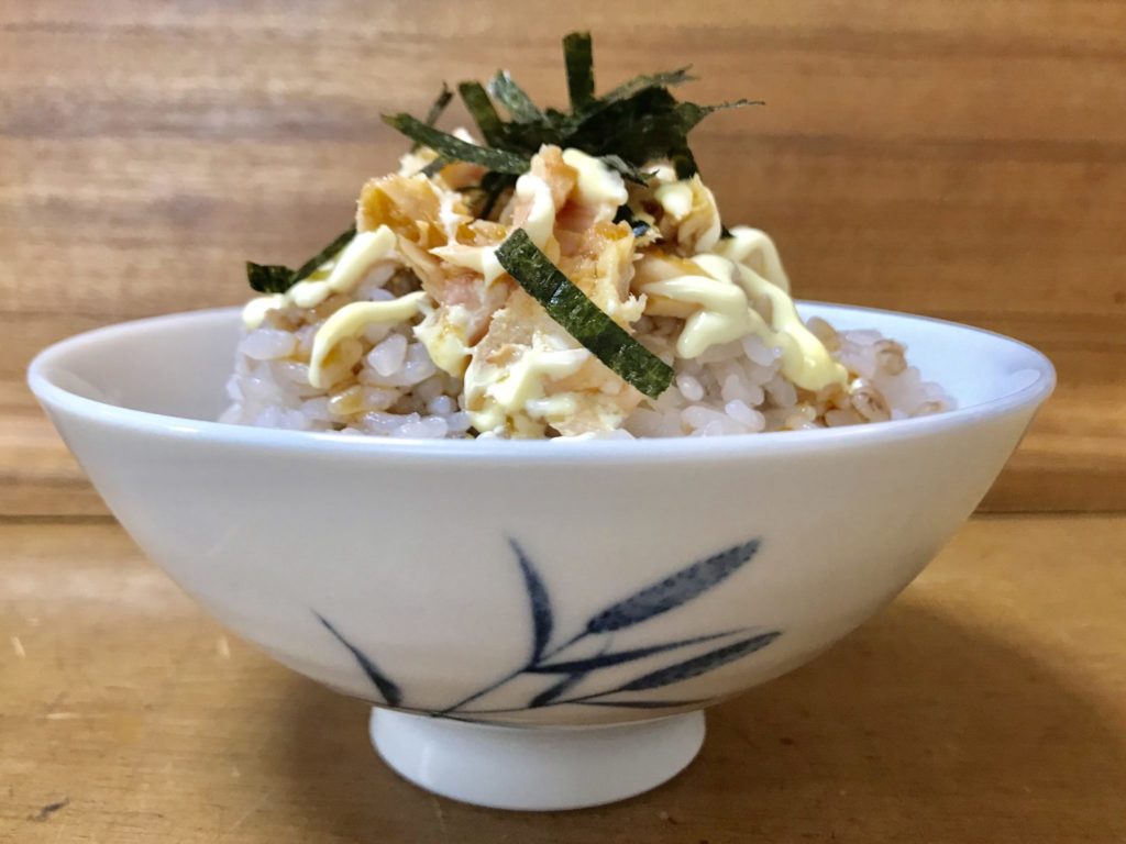 ご飯にホワイトツナの身をのせて、マヨネーズに醤油を垂らして刻み海苔を加えただけで食べ応えある美味しいホワイトツナ丼ができあがります。身が大きいのでこれだけで迫力と満足感がありますね。オリーブオイルの風味に醤油とマヨネーズがアクセントになって美味しかったです。