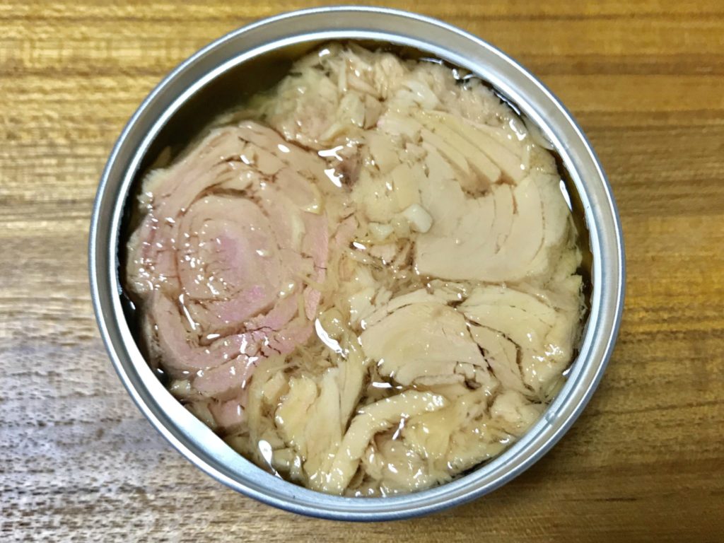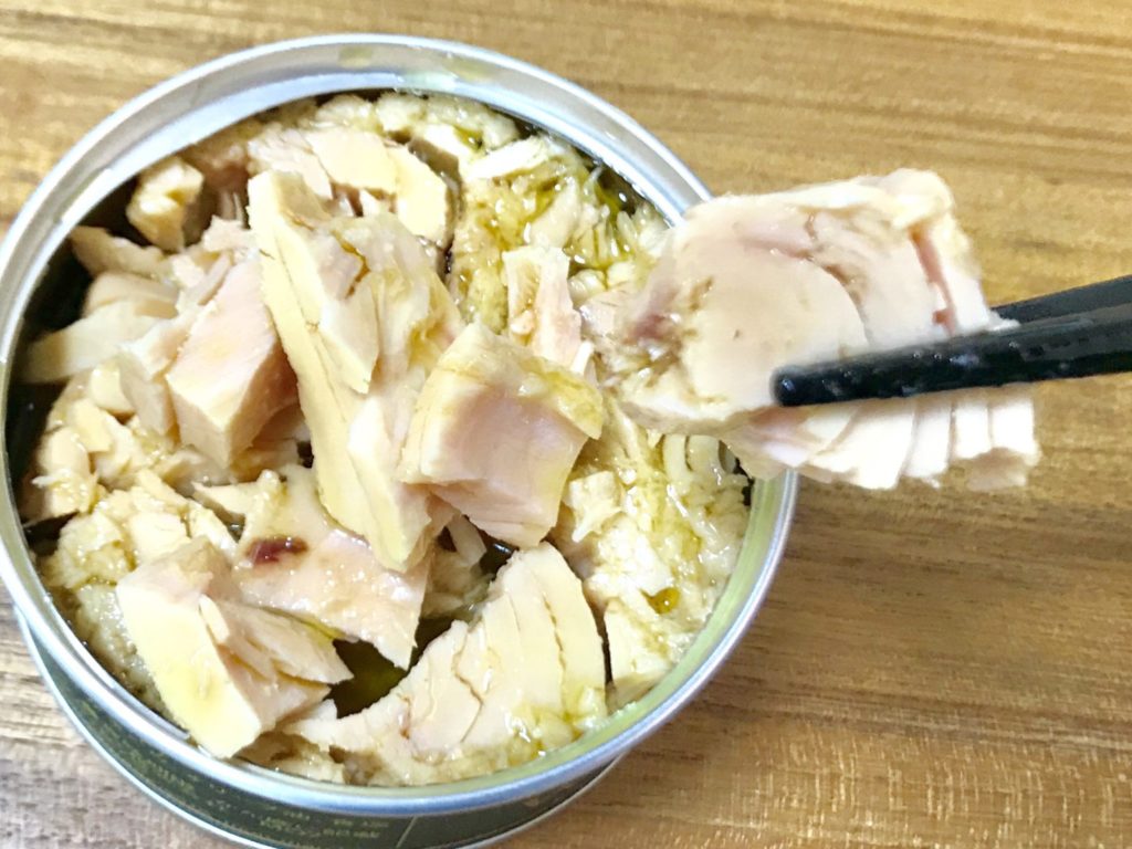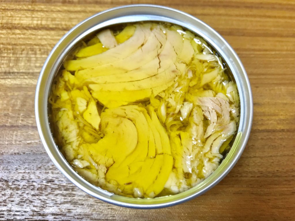 缶の蓋を開けるとオリーブオイルに浸った大きい身のホワイトツナの身が。こんなに大きい身が入っているツナ缶は人生初だったので感動です。大きい身の一切れを食べてみるとやはり固形は食べ応えありですね。オリーブオイルベースなので色々な料理にそのまま使いやすいのが嬉しい。