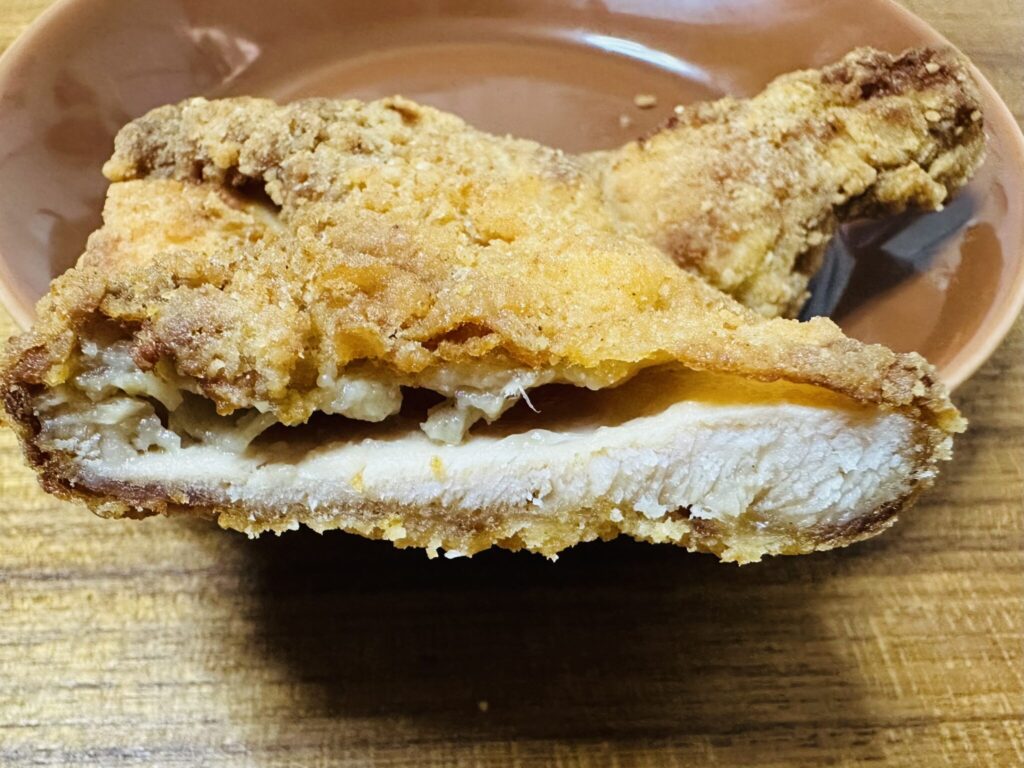 実際に食べてみると、衣は米粉入りらしくザクザクとした歯切れの良い食感。噛んだ瞬間の音と軽さが印象的です。