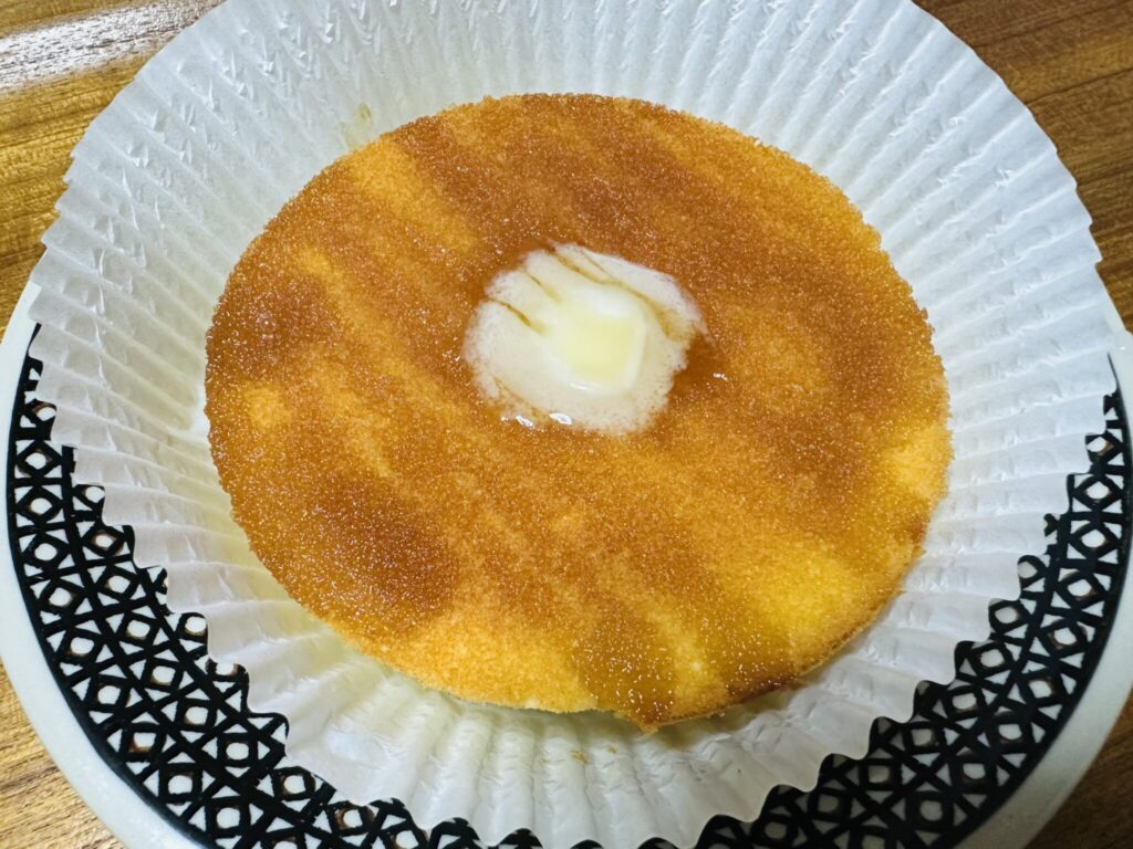 店頭ではメープルシロップが付いてきますが、冷凍タイプにはシロップは付属しません。その代わり、パンケーキの上にはバターがのった状態。