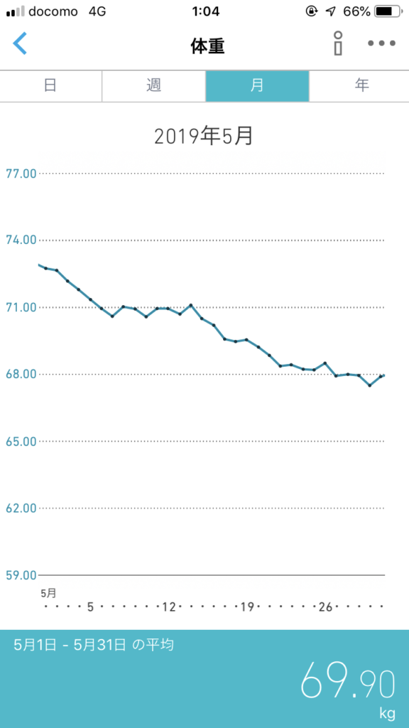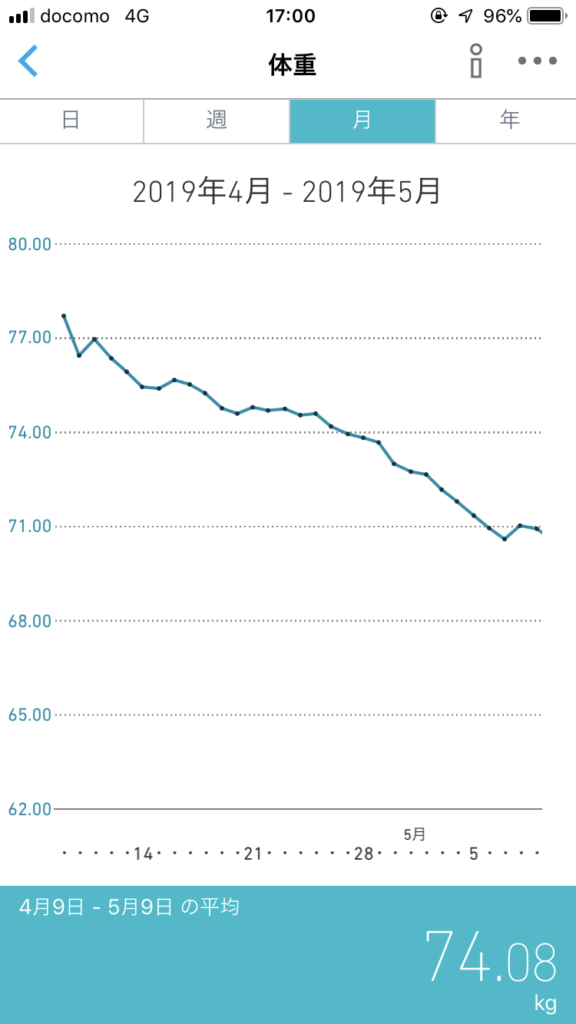 人生で初めての79kgになり身長は180cm以上あるのですが、がっちりというよりは太ったかなと鏡を見て思いました。さすがにこれはまずいと思いオムロンの体重計を購入して4月9日から毎日グラフを見ることで楽しみながらダイエットができました。食べたいものを食べつつ、一日のカロリーを摂りすぎない様にして1ヶ月で約7kg痩せることができました。