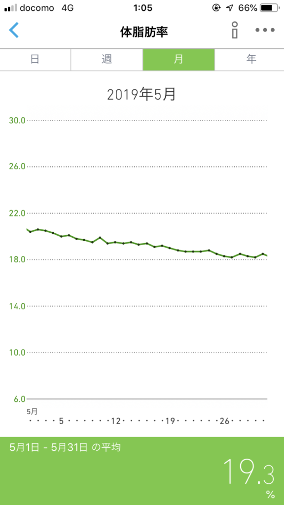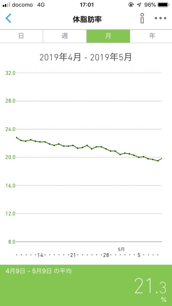 オムロン体重計での計測で4月9日に23.2%と高めでしたが、現在は18%をもう少しで切れそうです。まだまだ体脂肪率は高いのでこのままじっくりと時間をかけて12%位にしたいと思っています。高校生の時に激しい運動をしていた時は7%の時だったので、年月をかけて脂肪を蓄えて行ったのが数値を見てわかります。