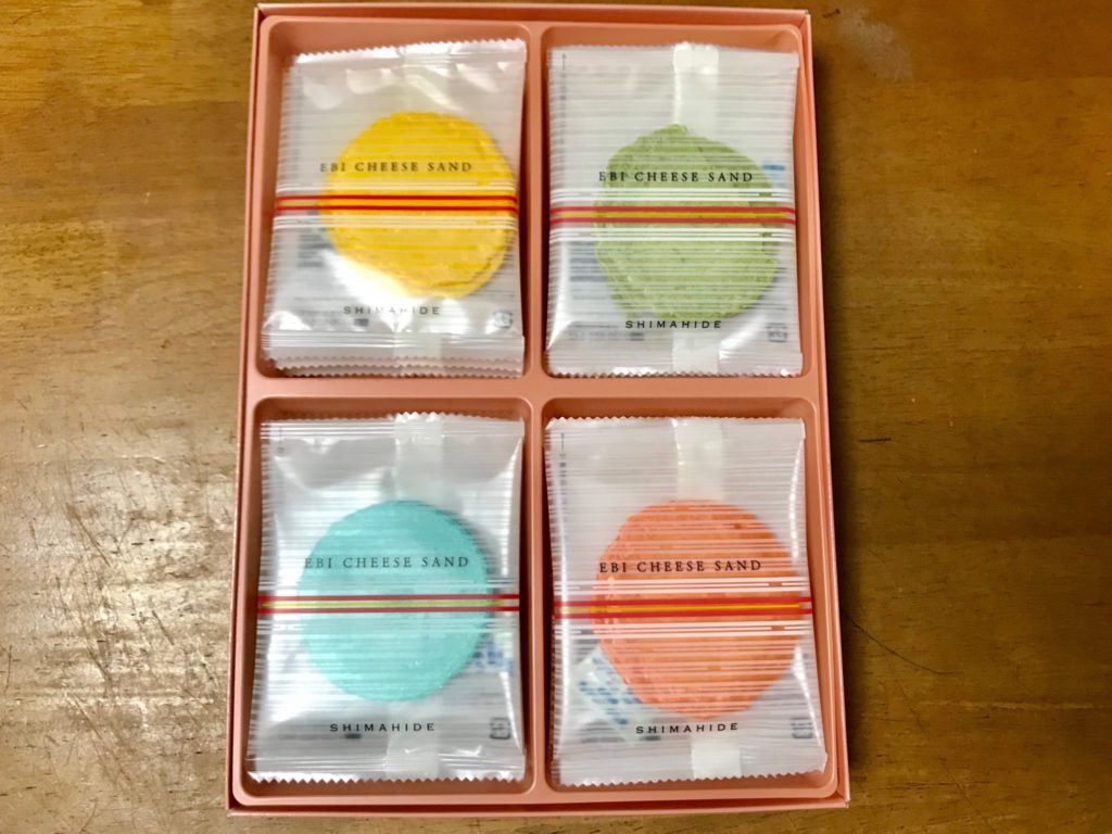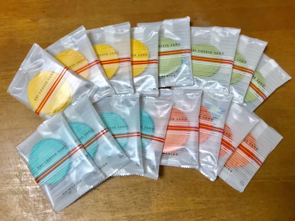 手のひらサイズの軽いえびせんですが濃厚なチーズ風味は自分用にもオススメ。