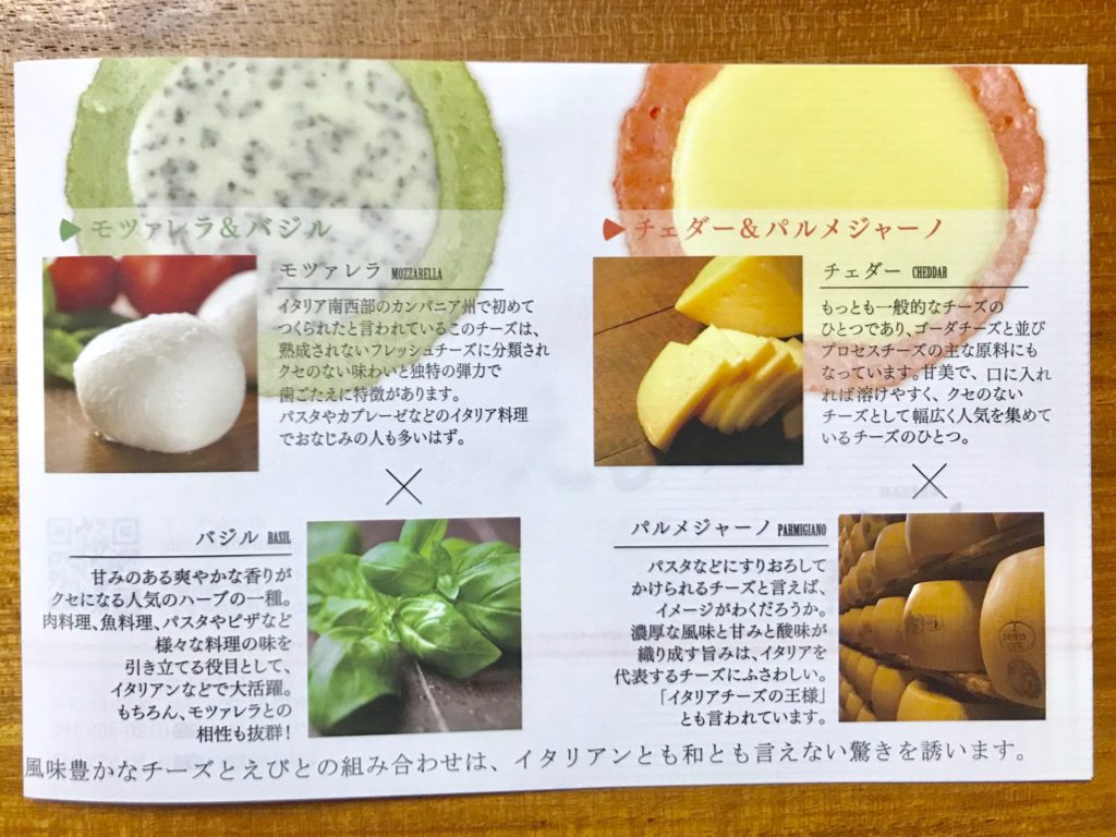 原材料は、えび、ばれいしょでん粉、植物油脂、乳糖、プロセスチーズ、ホエイパウダー、蔗糖、食塩、バジル、ナチュラルチーズ、脱脂粉乳、デキストリン、黒コショウ、はちみつ、濃縮ホエイ、砂糖、バター、カゼイン、加工デンプン、調味料(アミノ酸等)、カロチノイド色素、甘味料(ステビア)、乳化剤、クチナシ色素、カゼインナトリウム、香料、リン酸塩(Na)、炭酸Ca、青色1号、アナトー色素、ウコン色素、赤色102号、赤色106号、黄色4号、(原材料の一部に大豆が含まれます)