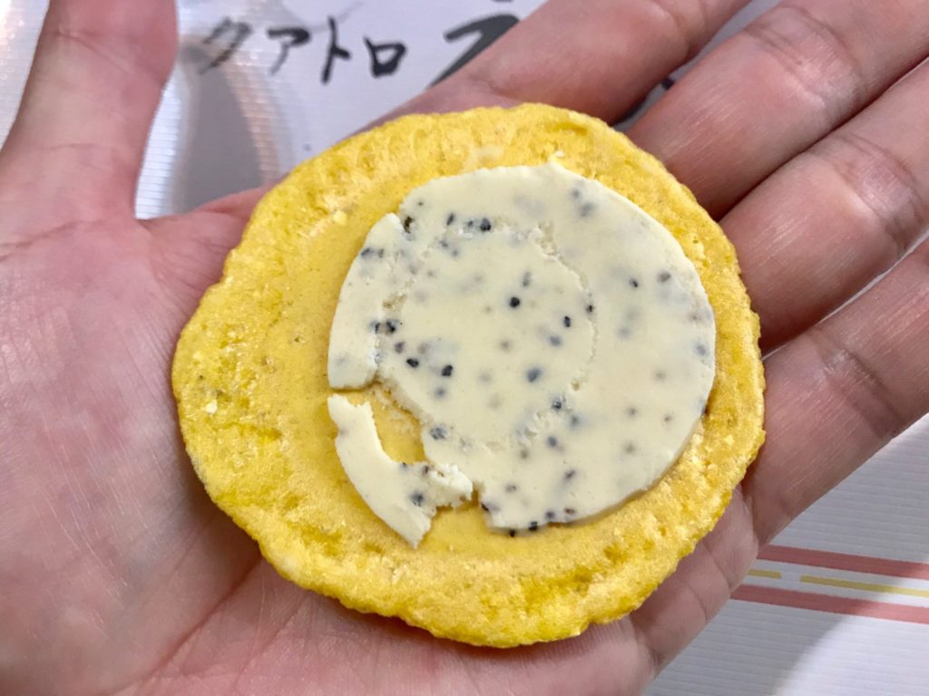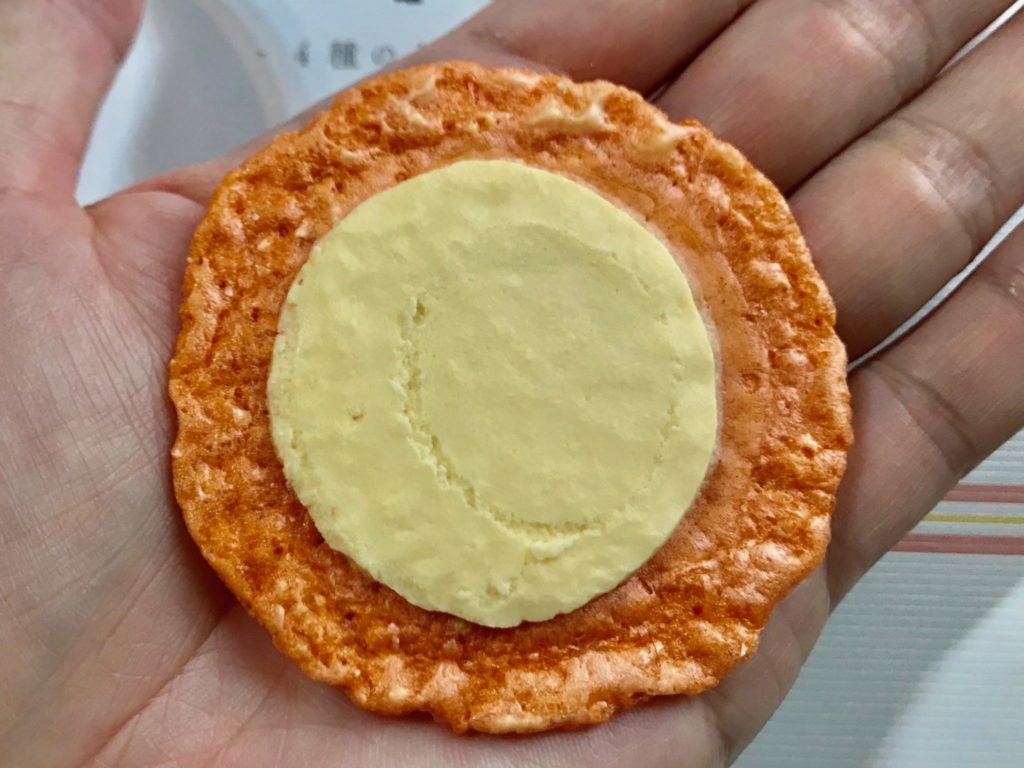 えびせんの淵いっぱいにチーズがサンドされているので一口食べると