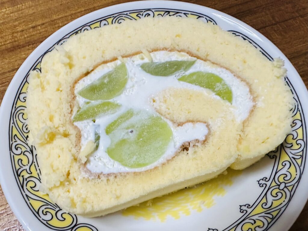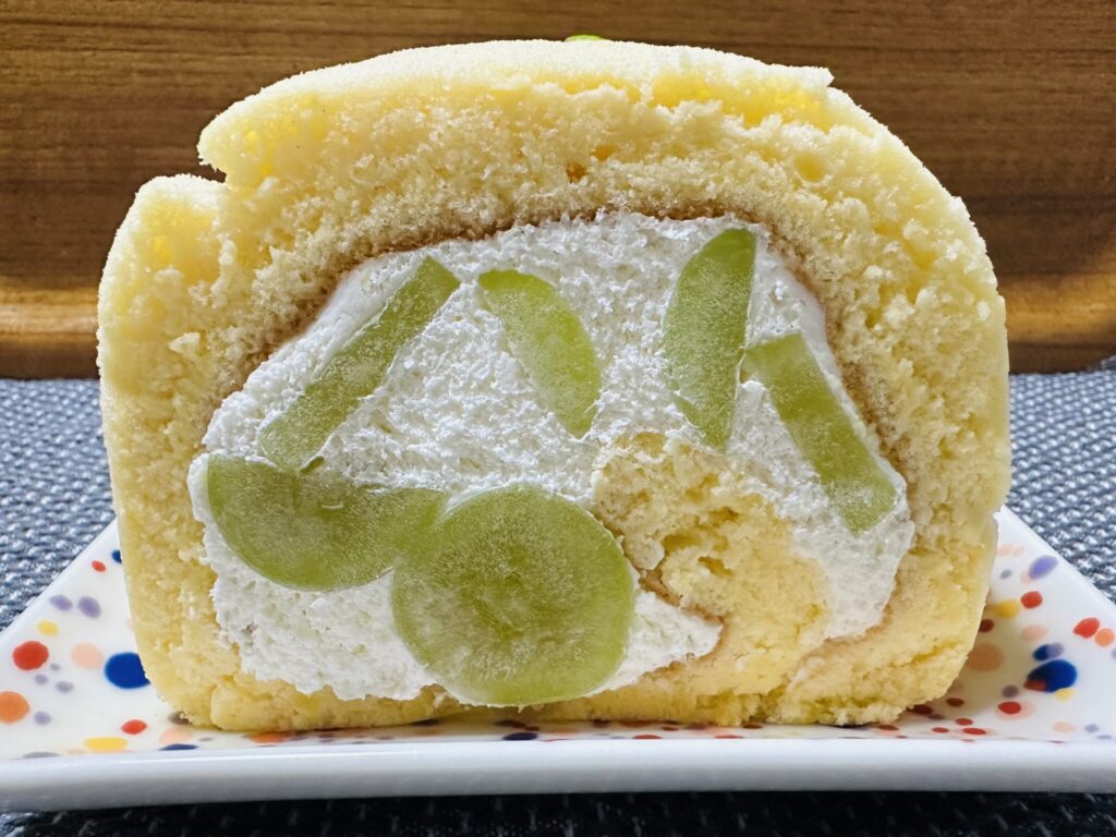 まず、カットした断面を見ると、スポンジ・クリーム・シャインマスカットの層がきれいで、ロールケーキとしてのバランスの良さが伝わってきます。