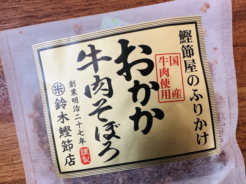 おかか牛肉そぼろの原材料は、牛肉(国産)、醤油、鰹節、砂糖、みりん、ごま(原材料の一部に小麦、大豆、牛肉を含む)。