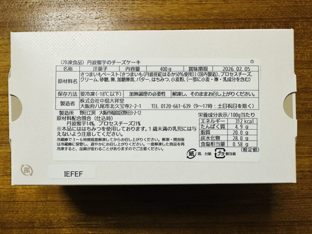 カロリーは100gあたり312kcal。チーズケーキとスイートポテトを重ねたケーキなので、軽いスイーツというよりは、満足感のあるタイプ。少量でもしっかり楽しめそうな印象です。